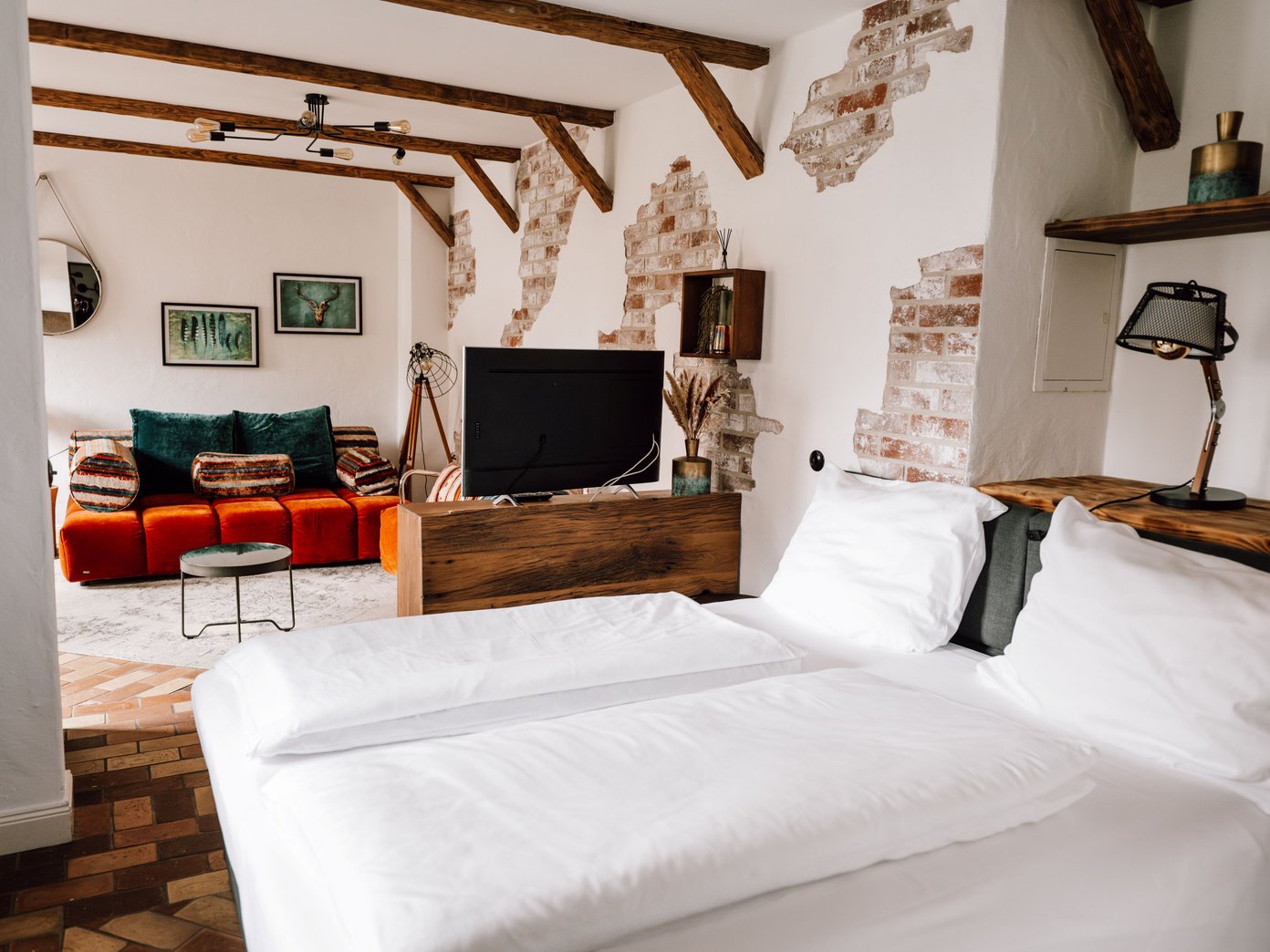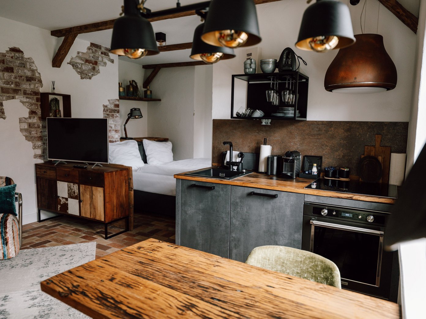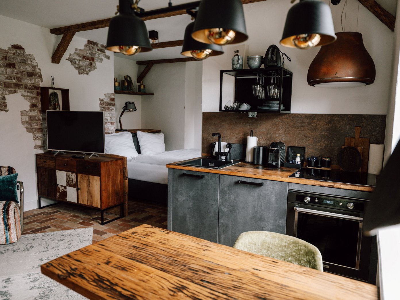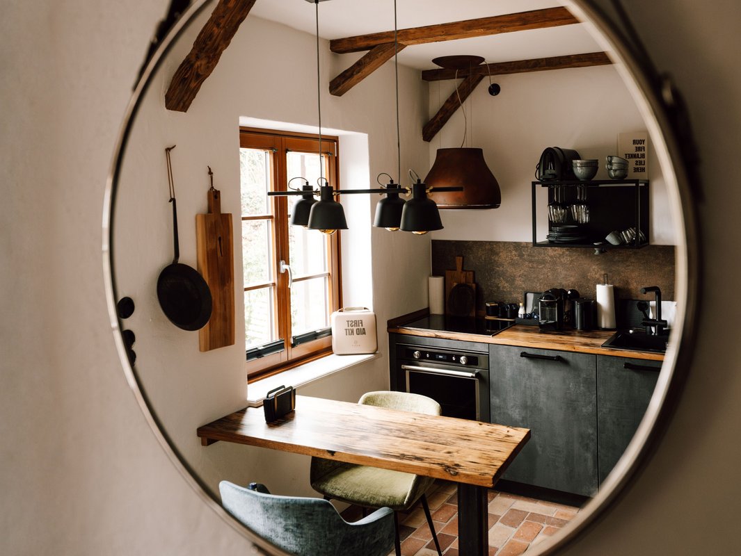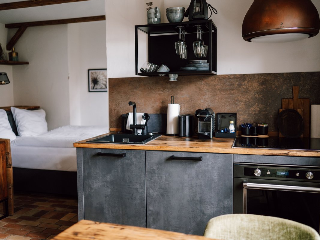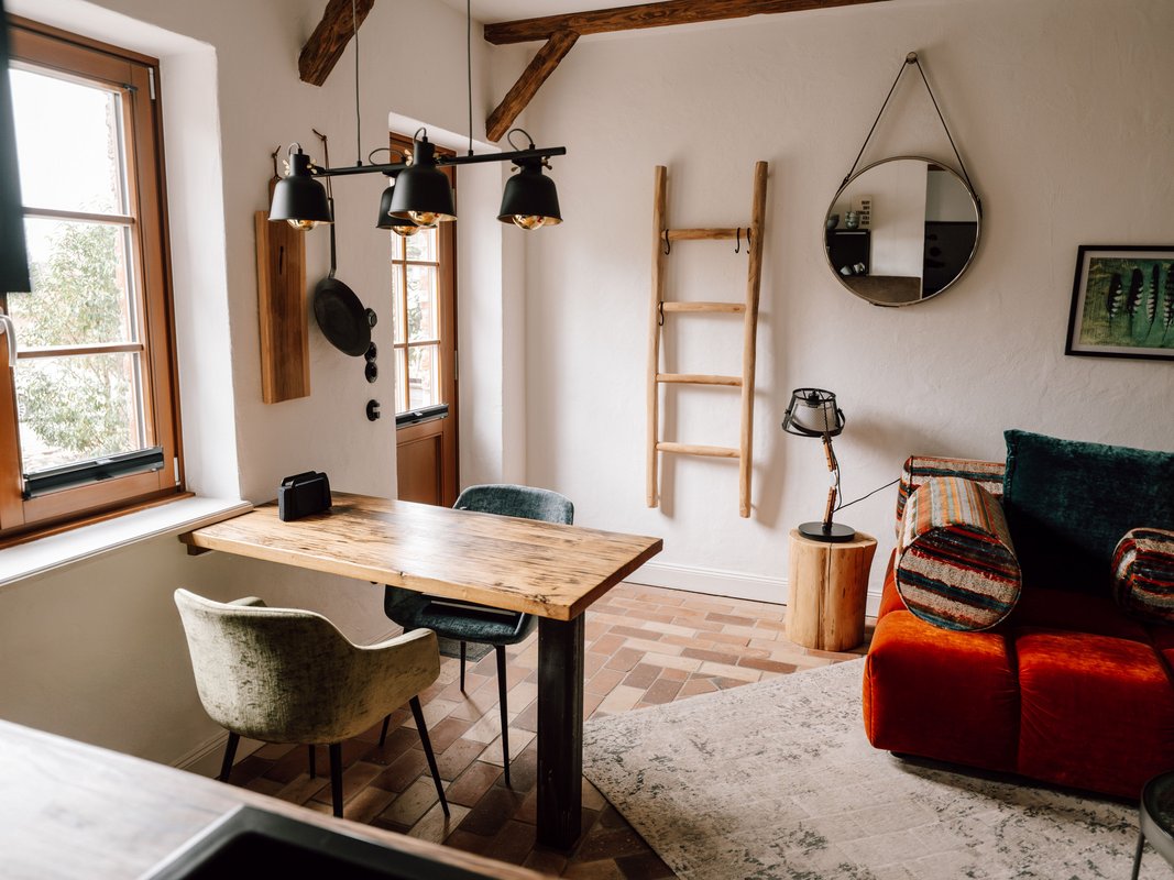 Der großzügige Wohn- und Essbereich lädt dazu ein, anzukommen, gemeinsam Zeit zu verbringen und den Aufenthalt ganz nach dem eigenen Rhythmus zu gestalten. Hochwertige Designermöbel, natürliche Materialien und ein gemütliches Kingsize-Bett machen das Bauernhaus UG zu einem Ort, der stilvoll, besonders und zugleich wunderbar unkompliziert wirkt. Durch das Schlafsofa eignet sich das Apartment auch für Aufenthalte zu dritt.